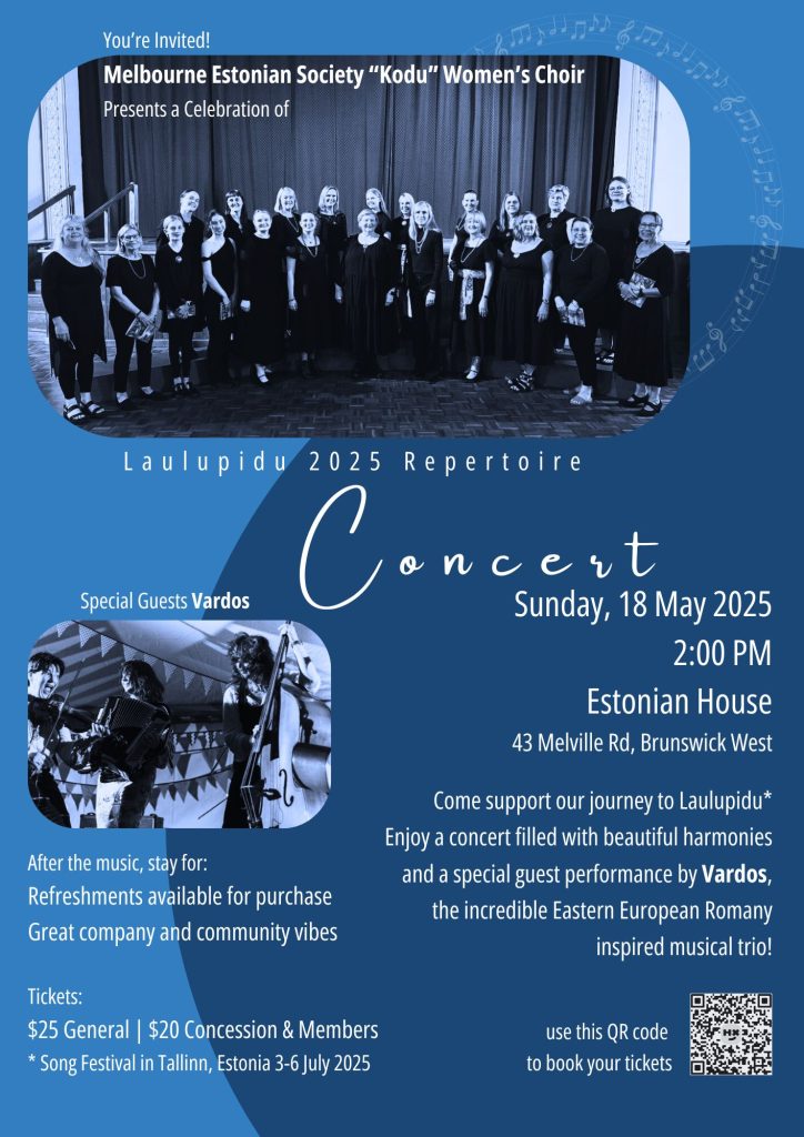 So again, please do come and join us for our celebratory concert this Sunday, 18 May 2025 at 2pm, at Estonian House in Melbourne (43 Melville Road, Brunswick West).