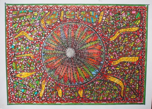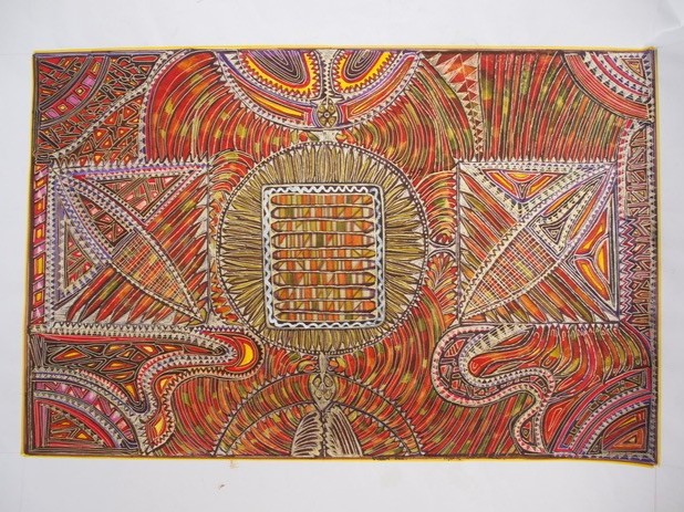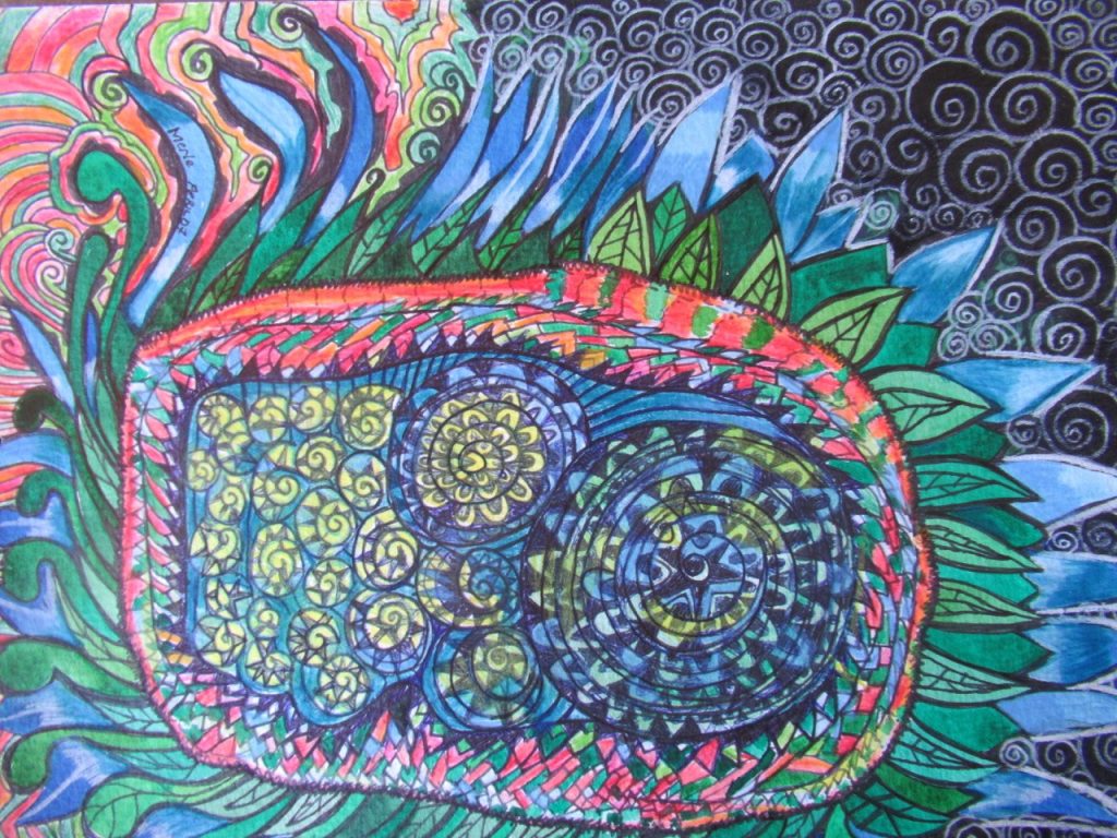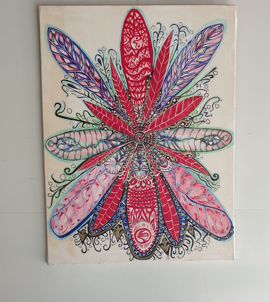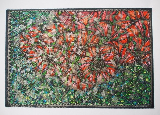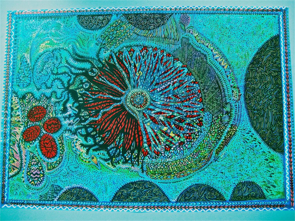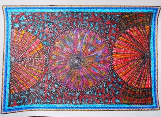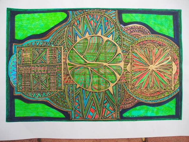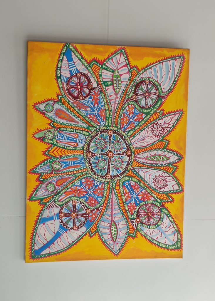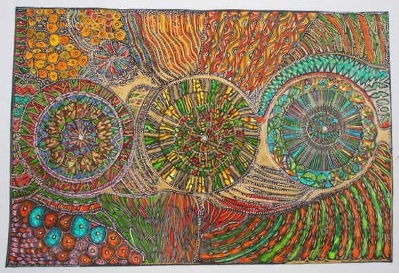 Across six decades of practice — and 30 years teaching high-school art — Merle has developed a distinctive visual language: intuitive linework, vibrant colour and textured forms that evoke spirit, memory and the microscopic architectures of life. Her inspirations span Paul Klee (“my favourite artist”), Vassily Kandinsky and Piet Mondrian, through to Buddhist mandalas and Australian Aboriginal painting — yet the result is unmistakably her own.